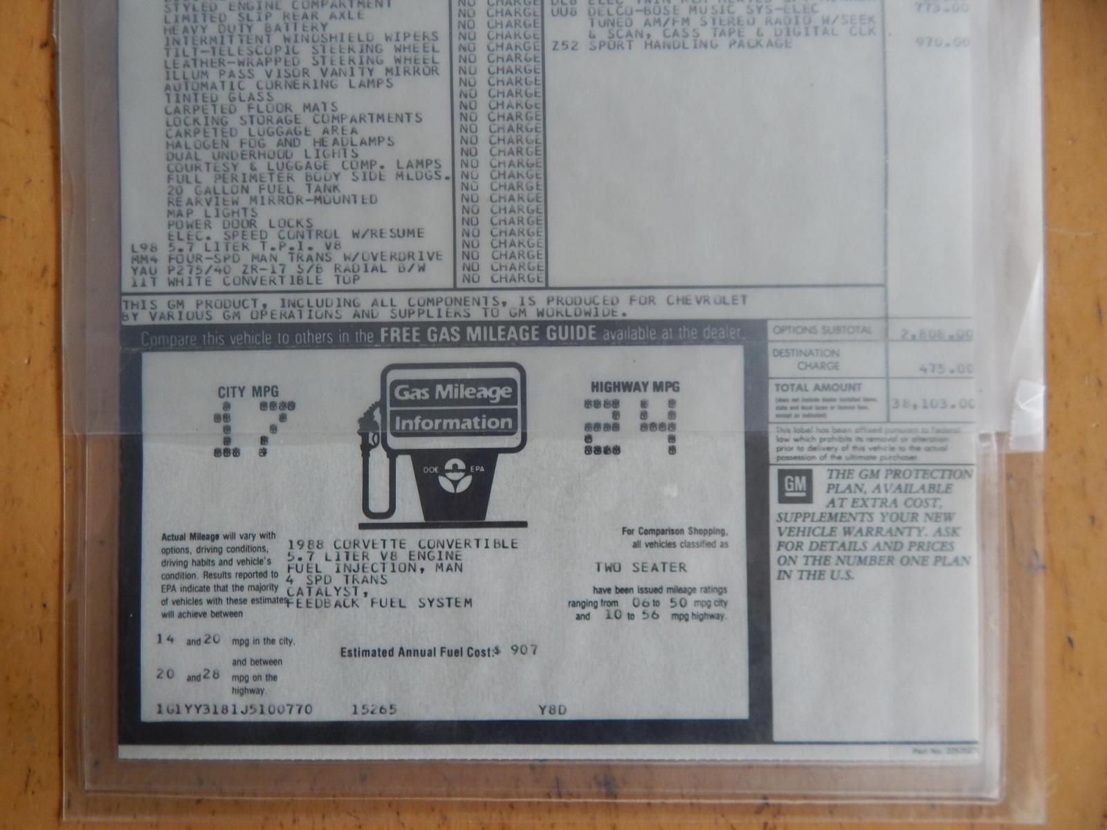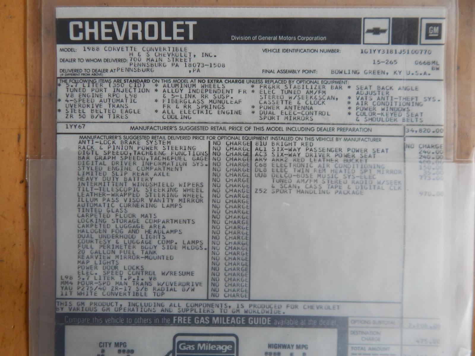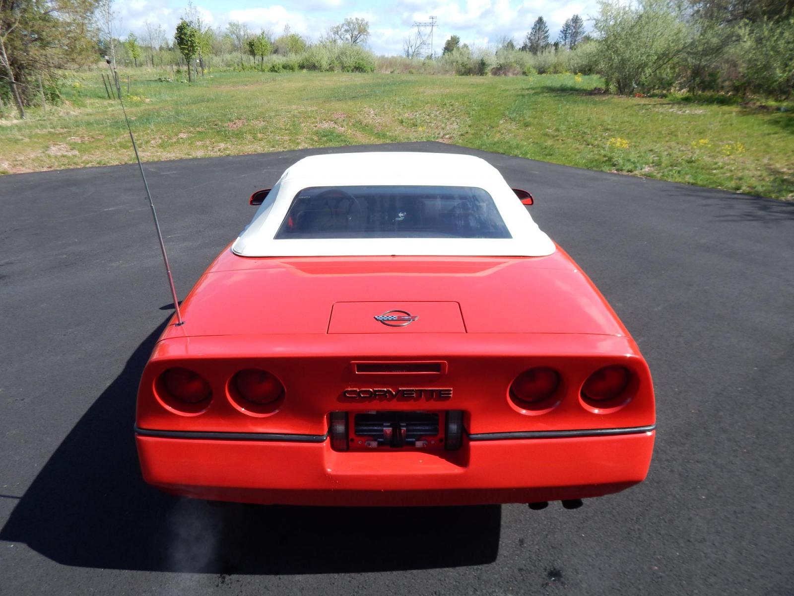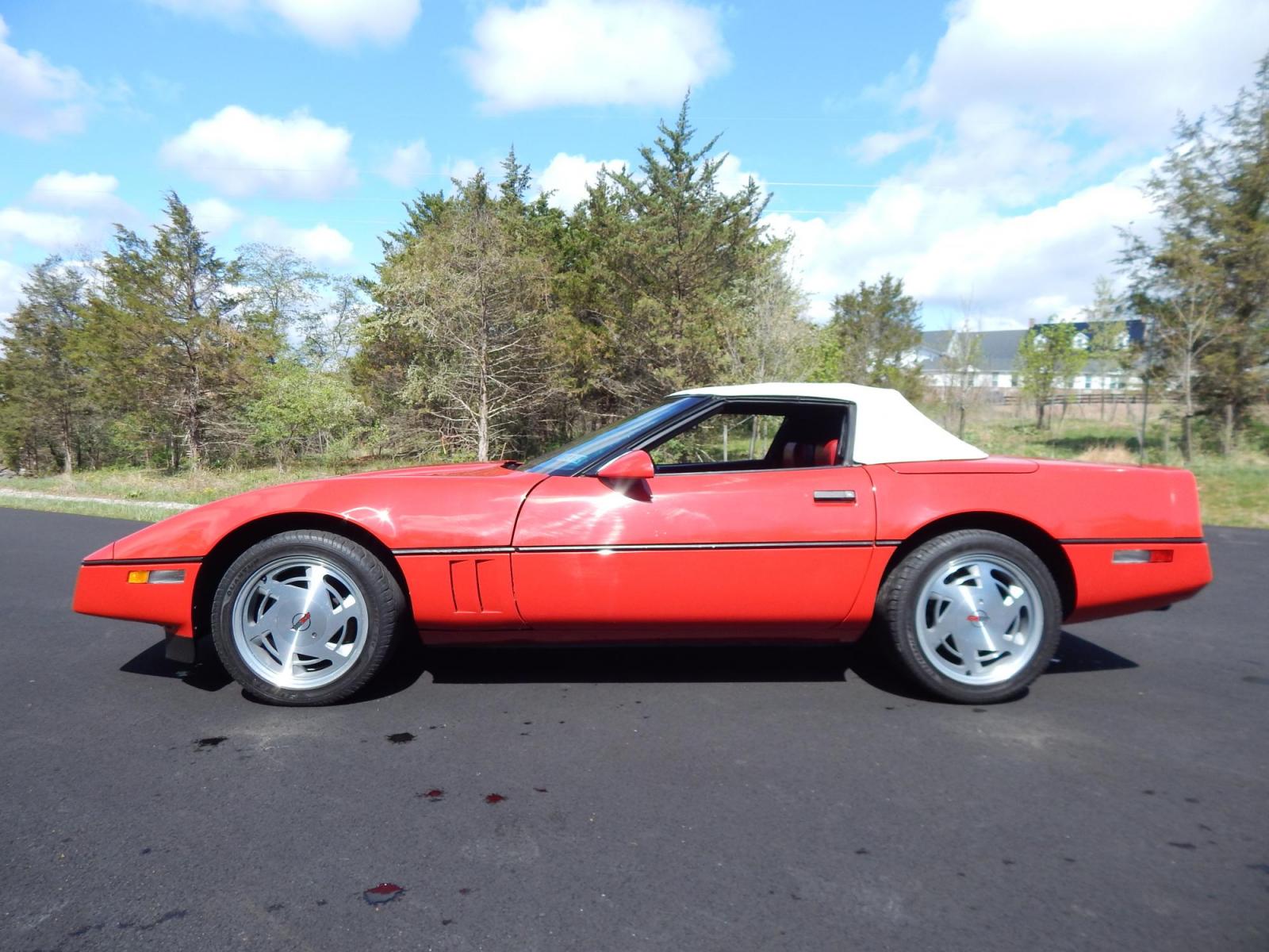 Here we have a beautifully kept, 23k original miles, Chevy Corvette Convertible with a 5.7L V8 putting power to the rear wheels via a smooth shifting 4 speed with overdrive transmission. Red paint with red leather interior and a white convertible top. Some options included are listed here. Please look at photos to see original window sticker that comes with the sale of this Corvette. Some options are: Aluminum wheels, A/C, Electric tuned AM/FM Stereo with cassette and clock, dual power electric seats, sport mirrors, seat back angle adjuster, anti-theft system, power windows, cover-keyed seat belts, anti-lock brakes, digital speedo, limited slip rear axle, intermittent windshield wipers, pop up headlights, 20 gallon fuel tank, electric speed control, dual underwood lights and most noticeable the Z52 sport handling package. This Corvette had a sticker price of $38,103 back in 1988! Carfax reports no accidents, 21 service records ands 2 previous owners! PA inspection good until 4/27! Please feel free to contact us with any questions at 215-862-9555. All prices exclude tax, tags, and our dealer fee of $297.50.